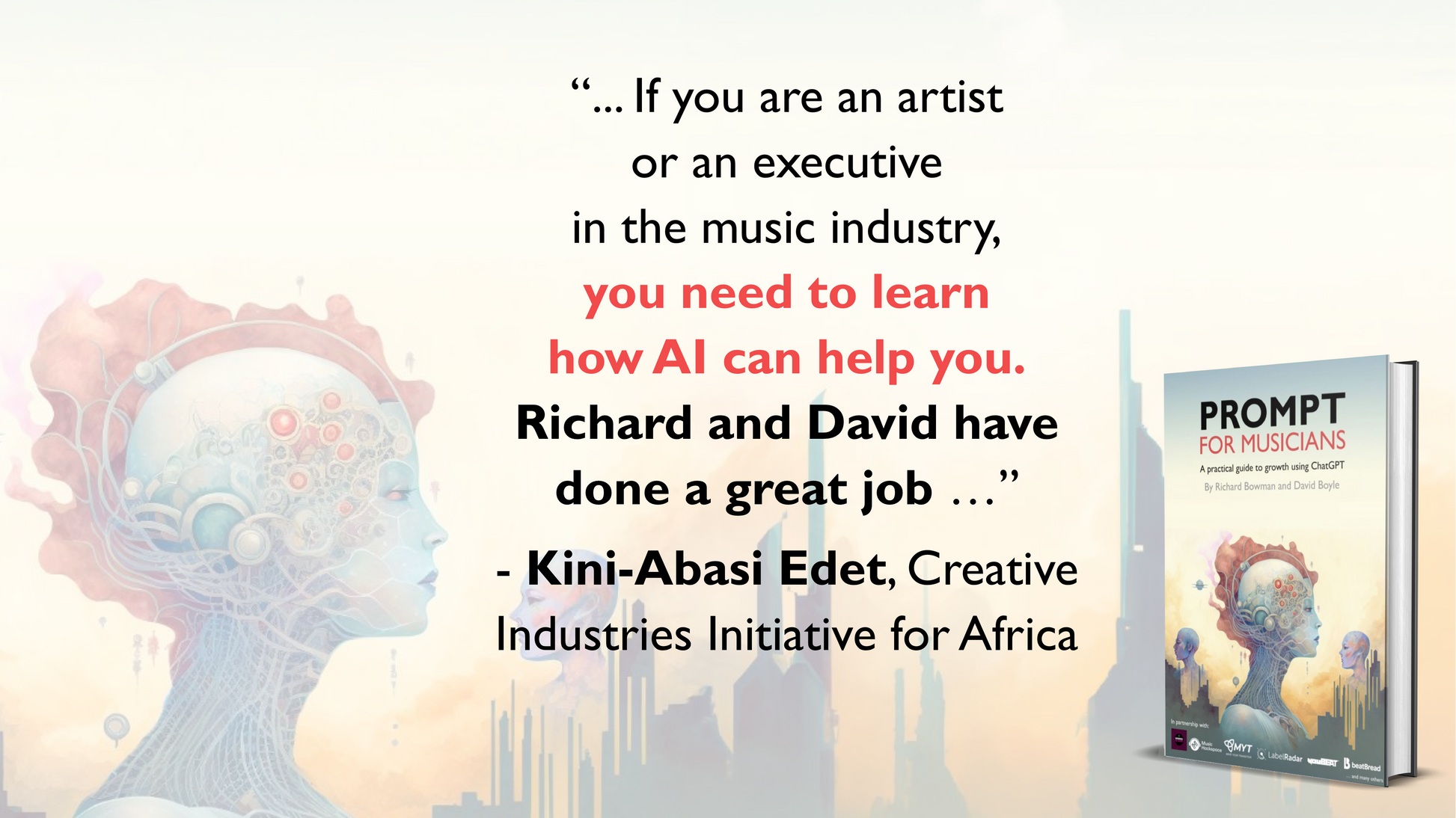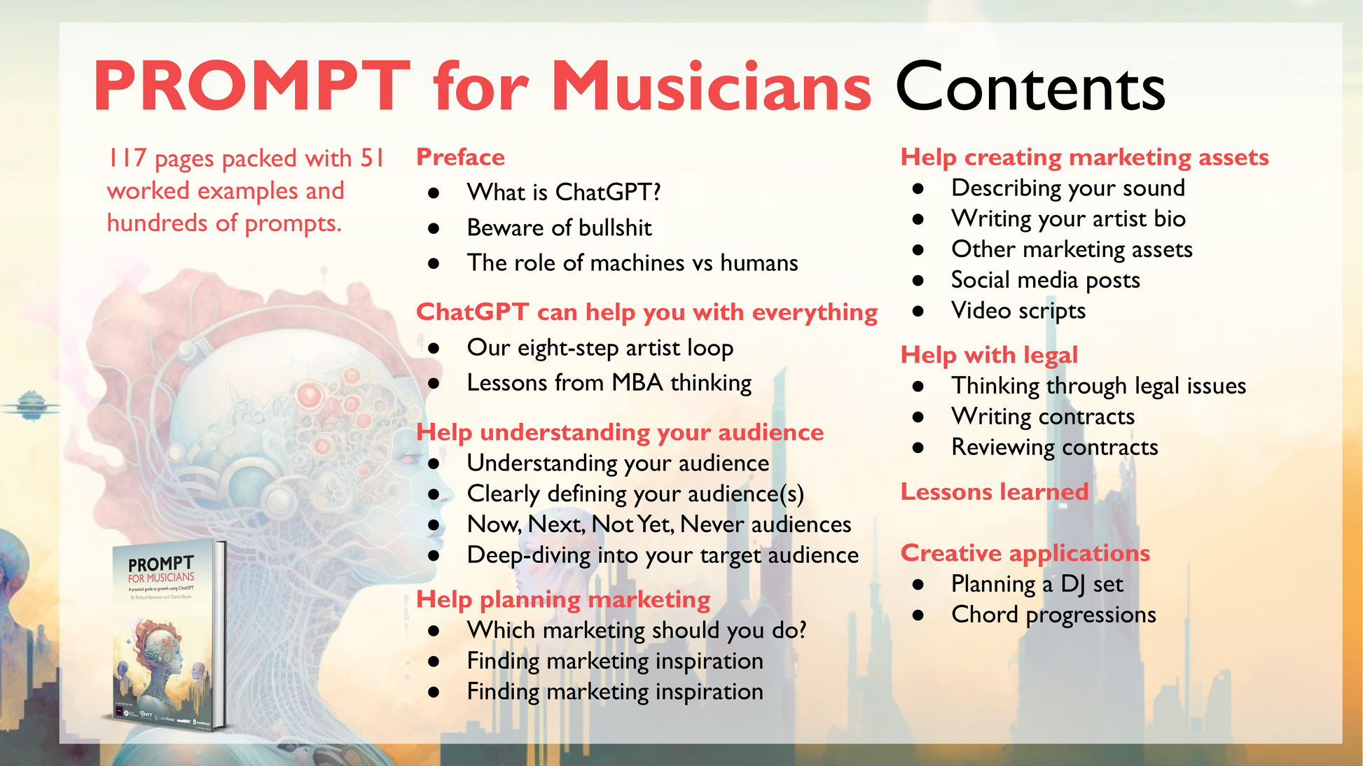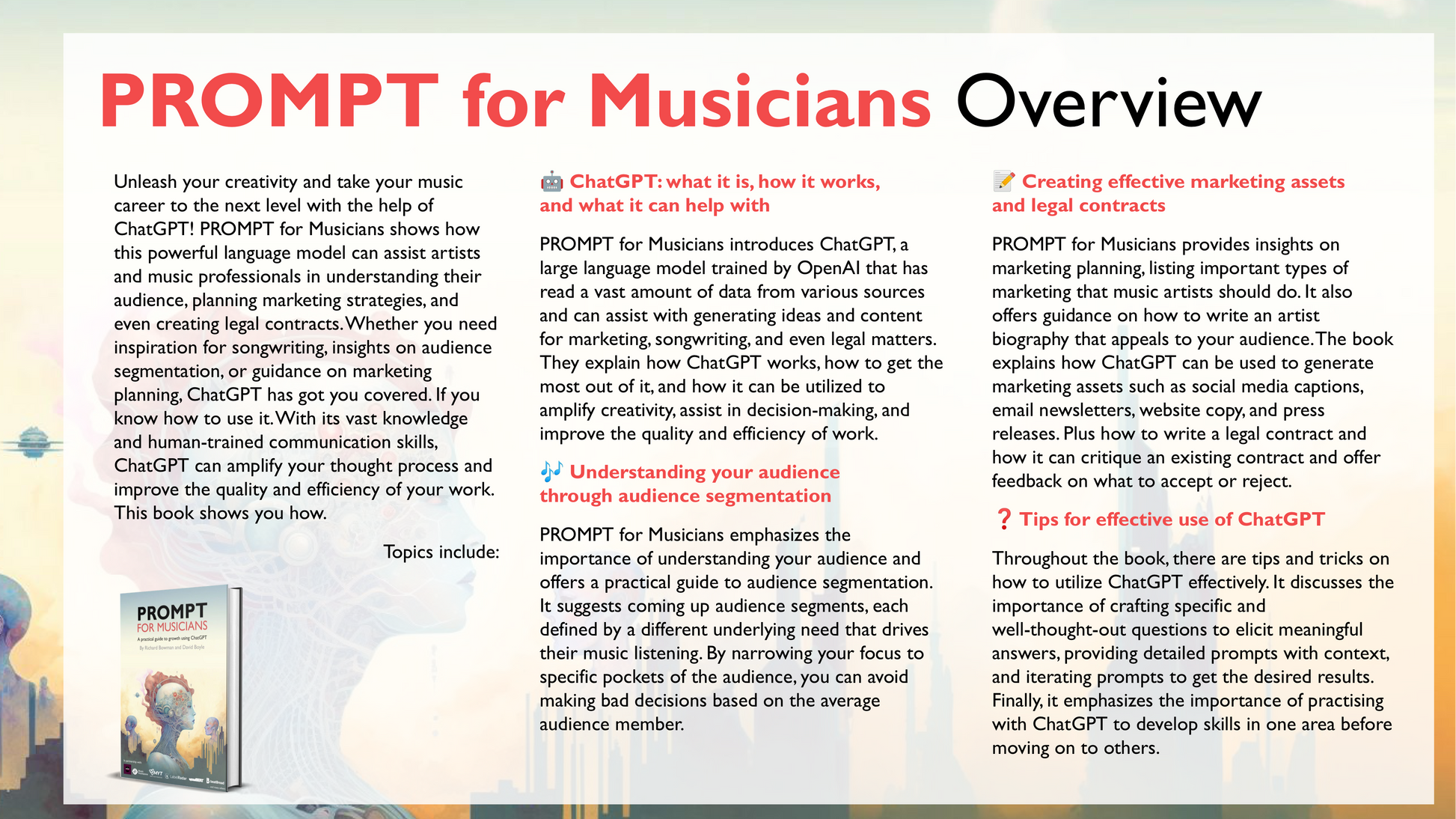 Join the AI revolution and take your music career to the next level with "PROMPT for Musicians." For a free ebook version and regular updates as the technology evolves, simply email the authors.